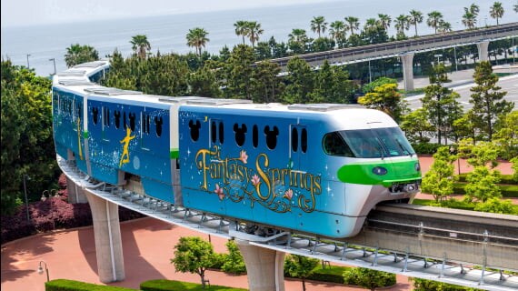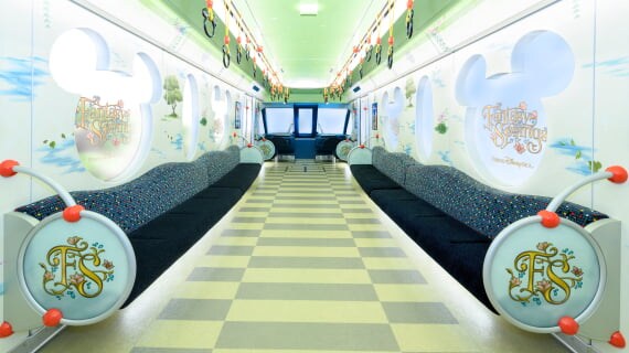「ファンタジースプリングス」に登場するディズニー映画『塔の上のラプンツェル』『ピーターパン』『アナと雪の女王』のキャラクターたちがデザインされた外装と、様々なキャラクターたちが描かれた色鮮やかな内装がゲストをお出迎えしました。