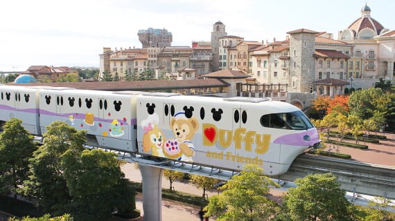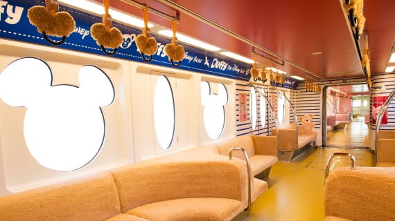 ダッフィーとお友だちのシェリーメイ、ジェラトーニをデザインしたリゾートライナーは、車内も特別仕様。ぬいぐるみと同じ生地を使ったふわふわの座席や吊革など、ダッフィーたちの世界観を思う存分お楽しみいただきました。