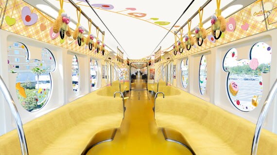車内には“秋の収穫祭”の準備をするミッキーやディズニーの仲間たちの姿が描かれにぎやかなリゾートライナーになりました。