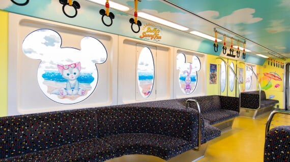 夏を楽しむダッフィー&フレンズがデザインされたリゾートライナー。ケープコッドの海辺をイメージした車内で、ダッフィーたちと一緒に思いっきり夏を楽しみました。