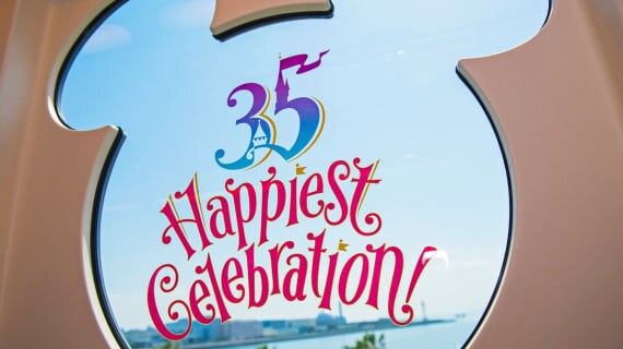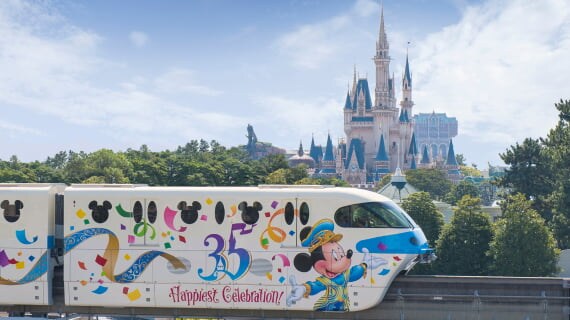 東京ディズニーリゾート35周年を記念して、外装には35周年のコスチュームに身を包んだミッキーと仲間たち、そしてテーマデザインであるリボンがちりばめられたデザイン。車内にも色鮮やかな花火が打ち上げられ、東京ディズニーリゾート史上最高に幸せな祭典を盛り上げました。