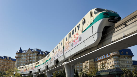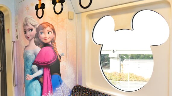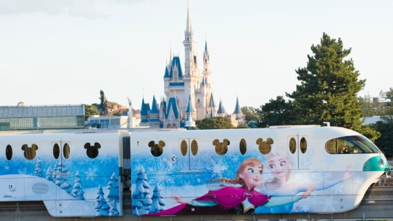 東京ディズニーランドのスペシャルイベント「アナとエルサのフローズンファンタジー」にちなんで、雪と氷の世界に包まれたモノレールが登場しました。アナとエルサをはじめとするディズニー映画『アナと雪の女王』の仲間たちが皆さんをお出迎えしました。