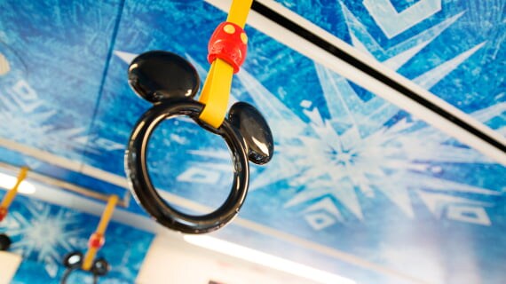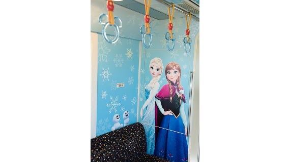 雪と氷の結晶のデザインがちりばめられた車内は、つり革もまるで氷のように透明!アナやエルサ、映画に登場するキャラクターたちとともに、雪の世界をお楽しみいただきました。