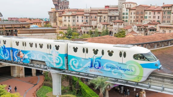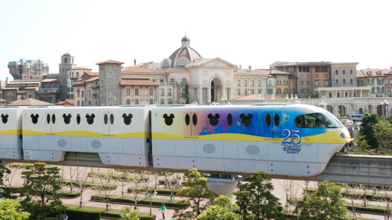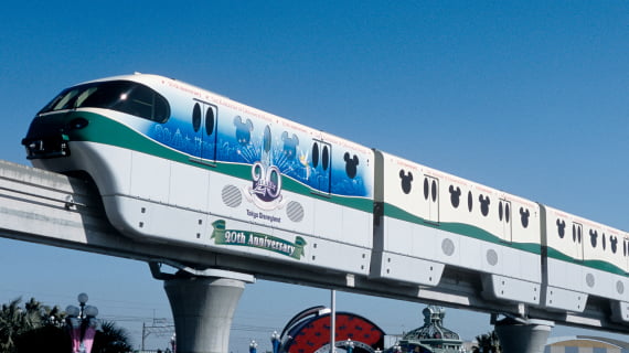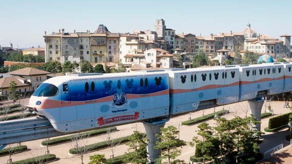 東京ディズニーランドの20周年を記念して、20thアニバーサリーのロゴを装飾した期間限定リゾートライナーが走行しました。