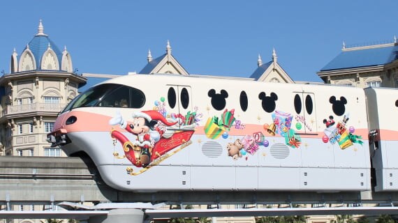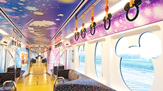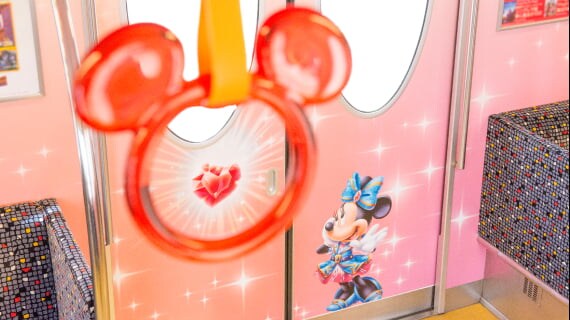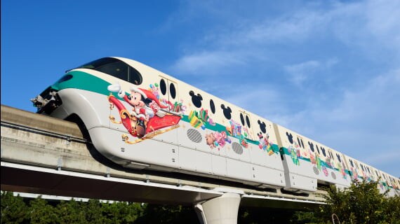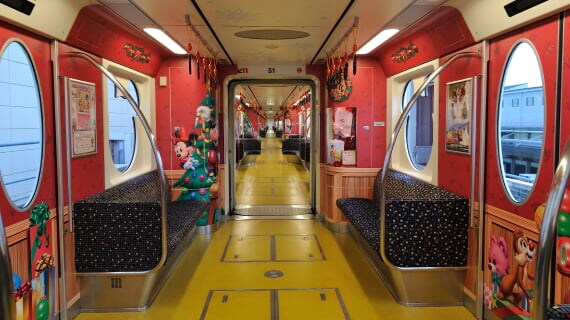 ミッキーマウスやダンボ、たくさんのクリスマスギフトがデザインされた「ディズニー・クリスマス・ライナー」が登場し、サンタクロースのようにイルミネーションで包まれた東京ディズニーリゾートを駆け巡りました。吊革にもサンタクロースの帽子が飾られ、車内に温かでかわいらしいクリスマスの世界が広がりました。