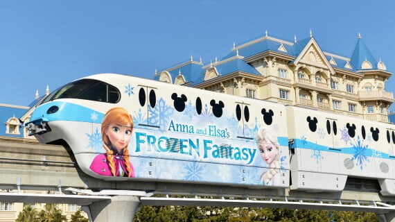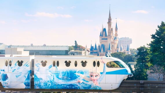 東京ディズニーランドで開催された「アナとエルサのフローズンファンタジー」にあわせ、アナとエルサ、そして愉快なオラフがデザインされたモノレールが登場!モノレールは、まるで雪と氷の結晶の世界となりました。