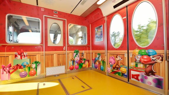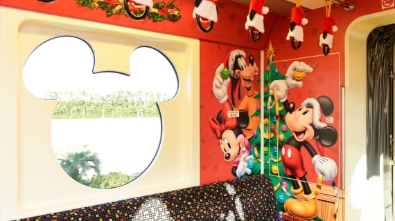 車体にはミッキーマウス、車内ではディズニーの仲間たちがクリスマスツリーのオーナメントの飾り付けをしていました。