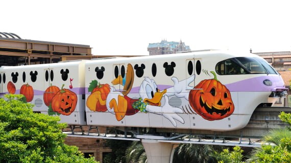 2つのパークのハロウィーンにあわせて、ドナルドとたくさんのかぼちゃがデザインされた「ディズニー・ハロウィーン・ライナー」が走行しました。