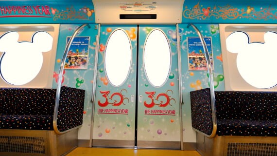 車内は、30周年コスチュームを身にまとったディズニーの仲間たちと、たくさんの“ハピネス・バルーン”がデザインされ、皆さんをお迎えしました。