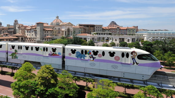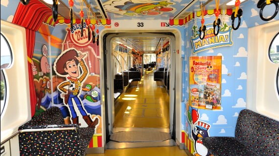 東京ディズニーシーのアトラクション「トイ・ストーリー・マニア!」のオープンを記念して、ウッディやバズなど映画でおなじみのキャラクターがデザインされ、「トイ・ストーリー・マニア!」の世界観をイメージしたかわいらしいリゾートライナーでした。