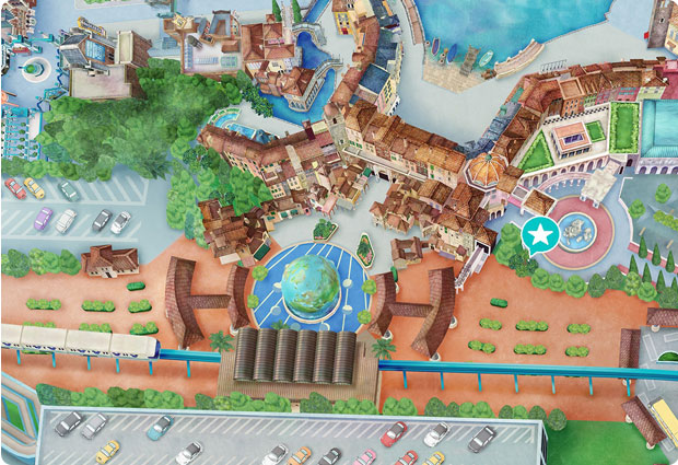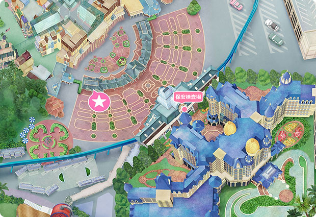 - ※東京ディズニーランドの集合場所はエントランスの保安検査通過後の場所となります。当日はディズニーリゾートライン東京ディズニーランド駅駅舎下中央の保安検査 (以下マップをご参照ください) からご案内いたします。その際、キャストに「お名前とパークオープンサインに参加すること」をご申告ください。