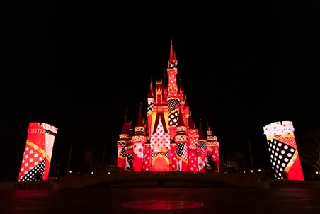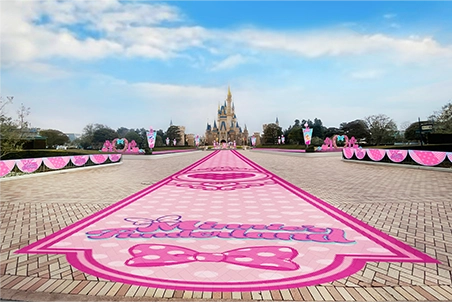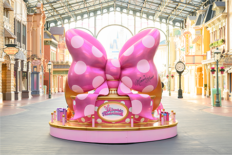 パークはミニーの大好きなものであふれ、いつものパークから様変わりしたポップでキュートな世界が広がります。ワールドバザールには大きなリボンのモニュメント、シンデレラ城正面のプラザの床面には水玉デザインのカーペットなどをお楽しみいただけます。