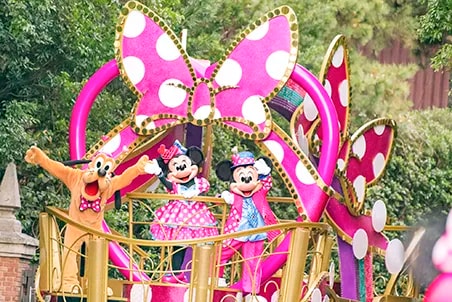 ハートのアクセサリーやラブリーなドット柄で彩られたとびきりキュートな衣装を身にまとったミニーマウスと仲間たちが、大きなリボンが特徴的なきらびやかなフロートに乗って登場します。