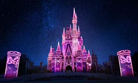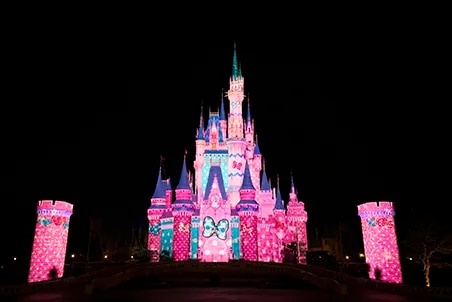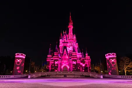 シンデレラ城の環境演出やピンクに光るデコレーションによりパークが一層ミニーに染まります。
