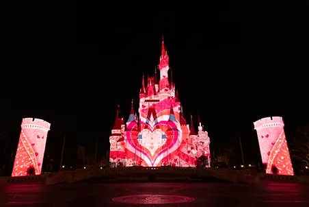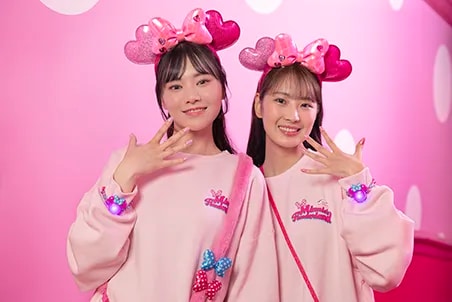 昼も夜もピンクに彩られたパークで、おそろいの身につけグッズや、ハートをモチーフにしたグッズを使って仲間といっしょに一日中楽しんじゃおう!