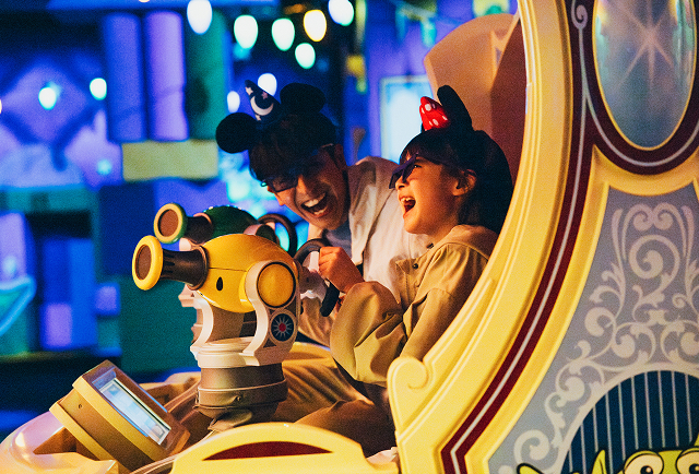 みんな大好きなディズニー&ピクサー映画『トイ・ストーリー』の世界へ。狙いを定めて、思わず真剣な表情になっちゃった。パパも私もつい本気になって、家族みんなで白熱する、楽しい時間。