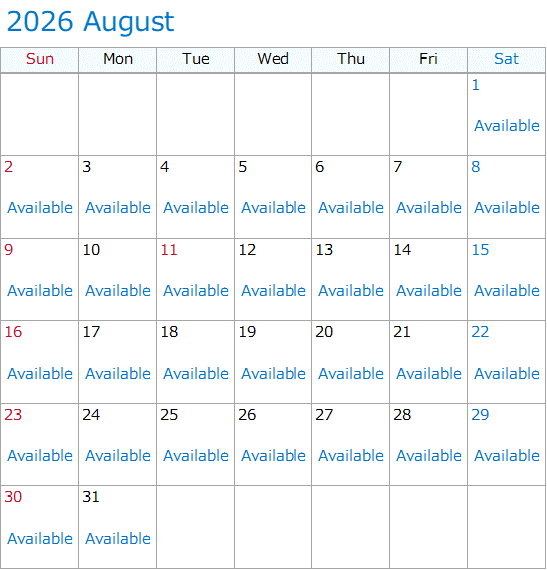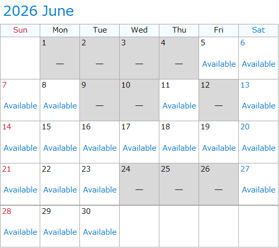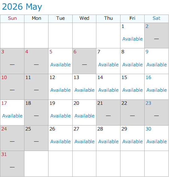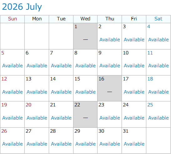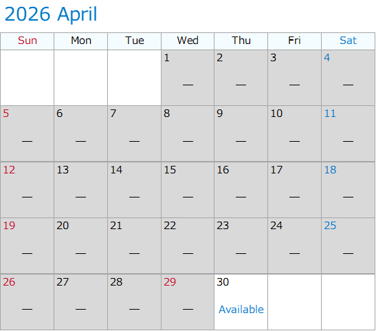 The information below is the availability as of 5:00 p.m., April 7, 2026.The information below may not represent the actual status of availability. The date which became unavailable may become available again without notice.