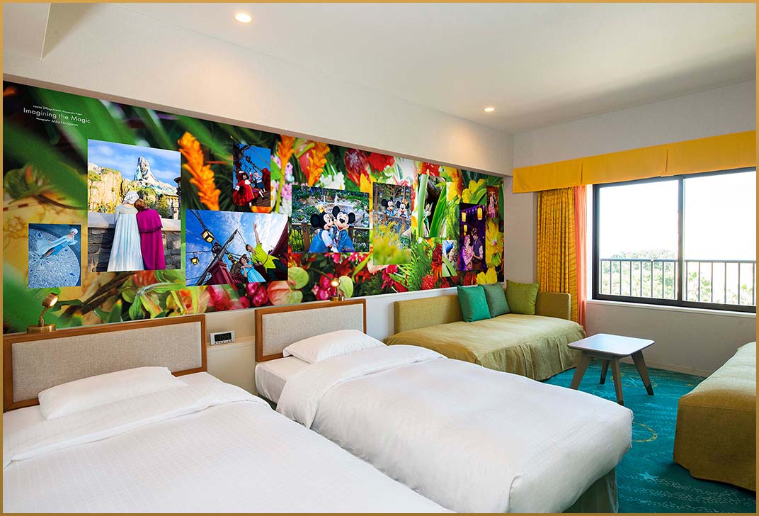 客室やロビー、中庭には、パークをイメージした装飾がたくさん。ロビーにはディズニー映画を楽しめるエリアも!