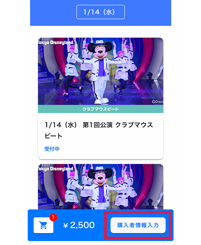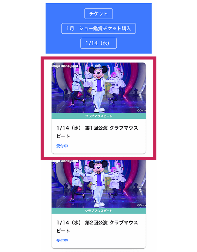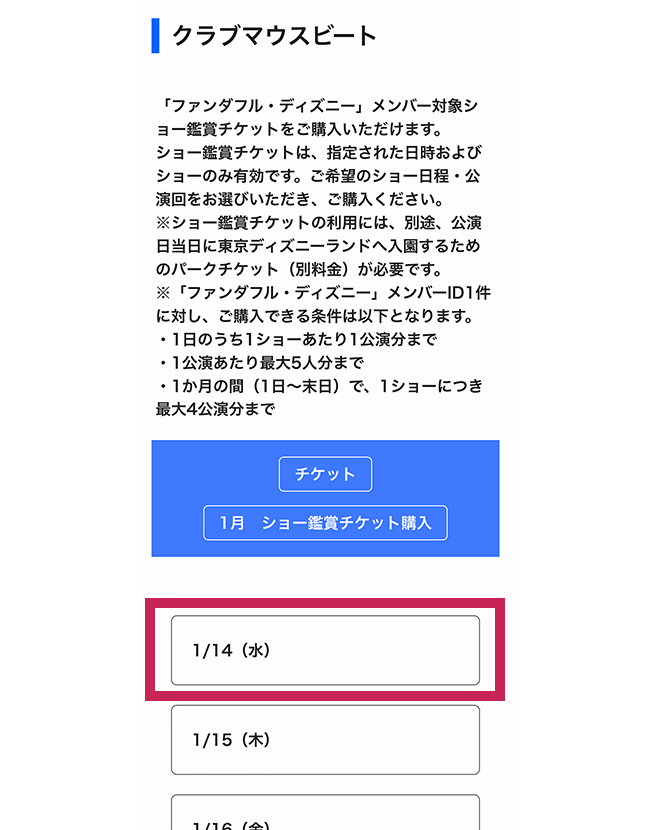 - ●1か月の間(※1月14日~31日)で、各ショーにつき最大4公演分のみ購入できます。