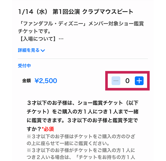 - ※追加できる座席/鑑賞位置数(無料)は、ショー鑑賞チケットを購入した枚数分までです。それ以上の3才以下のお子様分の追加が必要な場合は、事前に無料でご用意することはできません。事前に座席/鑑賞位置を確保してご一緒にご鑑賞いただく場合には、追加で必要な座席/鑑賞位置数をご購入ください。もしくは、当日のご鑑賞までに追加のご購入がない場合は、当日購入した施設および入場口のキャストにご相談ください。その場合、メンバー対象鑑賞エリアから離れた場所へのご案内となります。また場合によっては、鑑賞回のご変更やご鑑賞をお断りすることもございますので予めご了承ください。