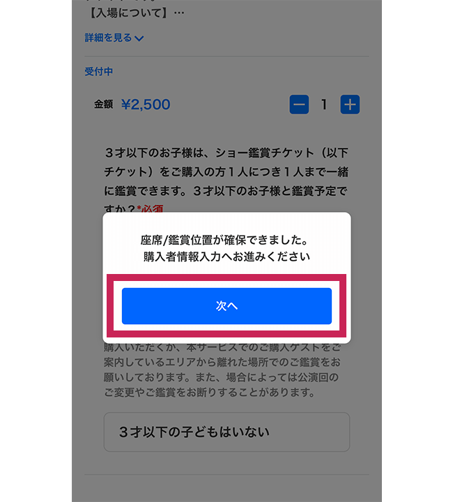 - 3才以下のお子様が大人1人につき3人以上いる場合は追加で座席/鑑賞位置をご購入いただくか、本サービスでのご購入ゲストをご案内しているエリアから離れた場所でのご鑑賞をお願いしております。また、場合によっては公演回のご変更やご鑑賞をお断りする場合もございます。あらかじめご了承ください。