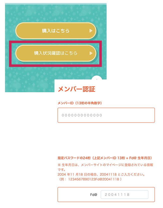 ショー公演当日、メンバーログイン後、「購入状況確認はこちら」ボタン先の購入サイトの「マイチケット」からショー鑑賞チケットの提示をしていただく必要があります。