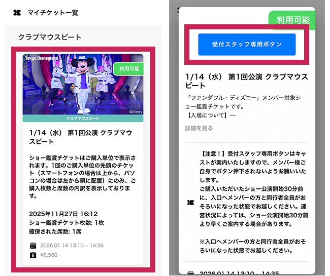 購入サイトの「マイチケット」からショー鑑賞チケットをご提示いただく必要があります。