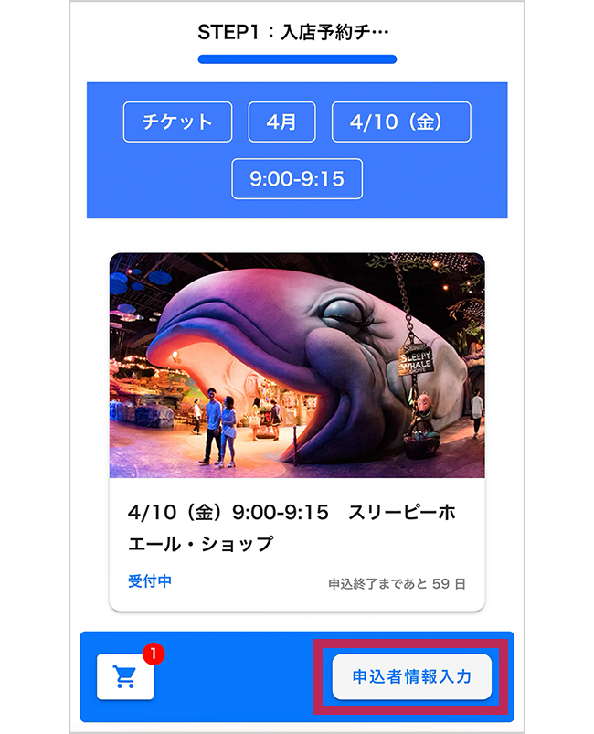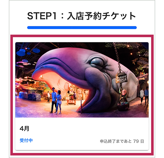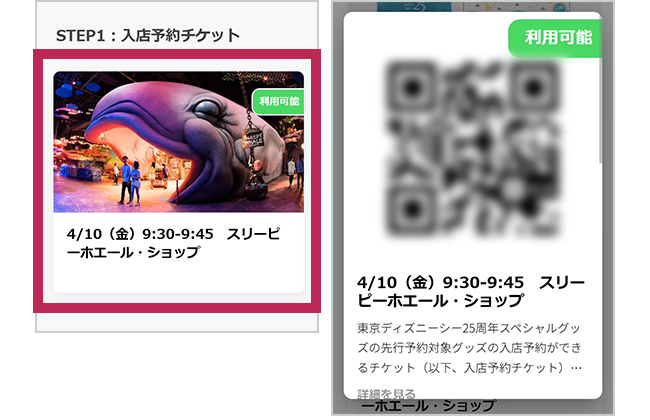 ・入店予約チケットに記載されている日時に、東京ディズニーシー マーメイドラグーン「スリーピーホエール・ショップ」へお越しください。