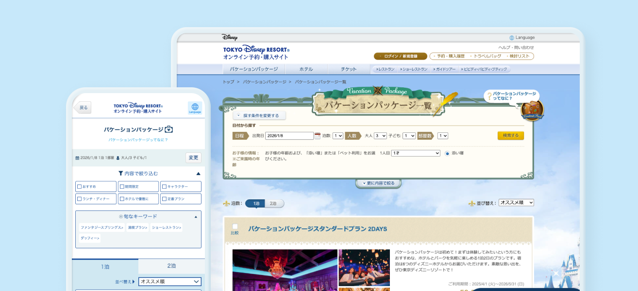 ディズニーホテルの宿泊・パークチケット・アトラクション利用券・ショー鑑賞券などをまとめて事前予約できる宿泊プラン「東京ディズニーリゾート・バケーションパッケージ」で、いつものパーク体験とは違った魅力を思いっきり味わってみませんか?