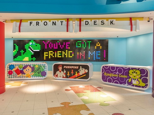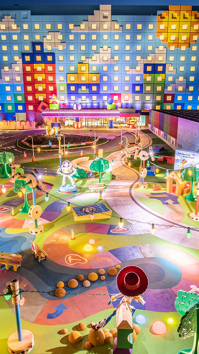 家族みんなで泊まりたかったホテル。中へ入ると、おもちゃのサイズになったみたいで、みんなのテンションが上がる!
